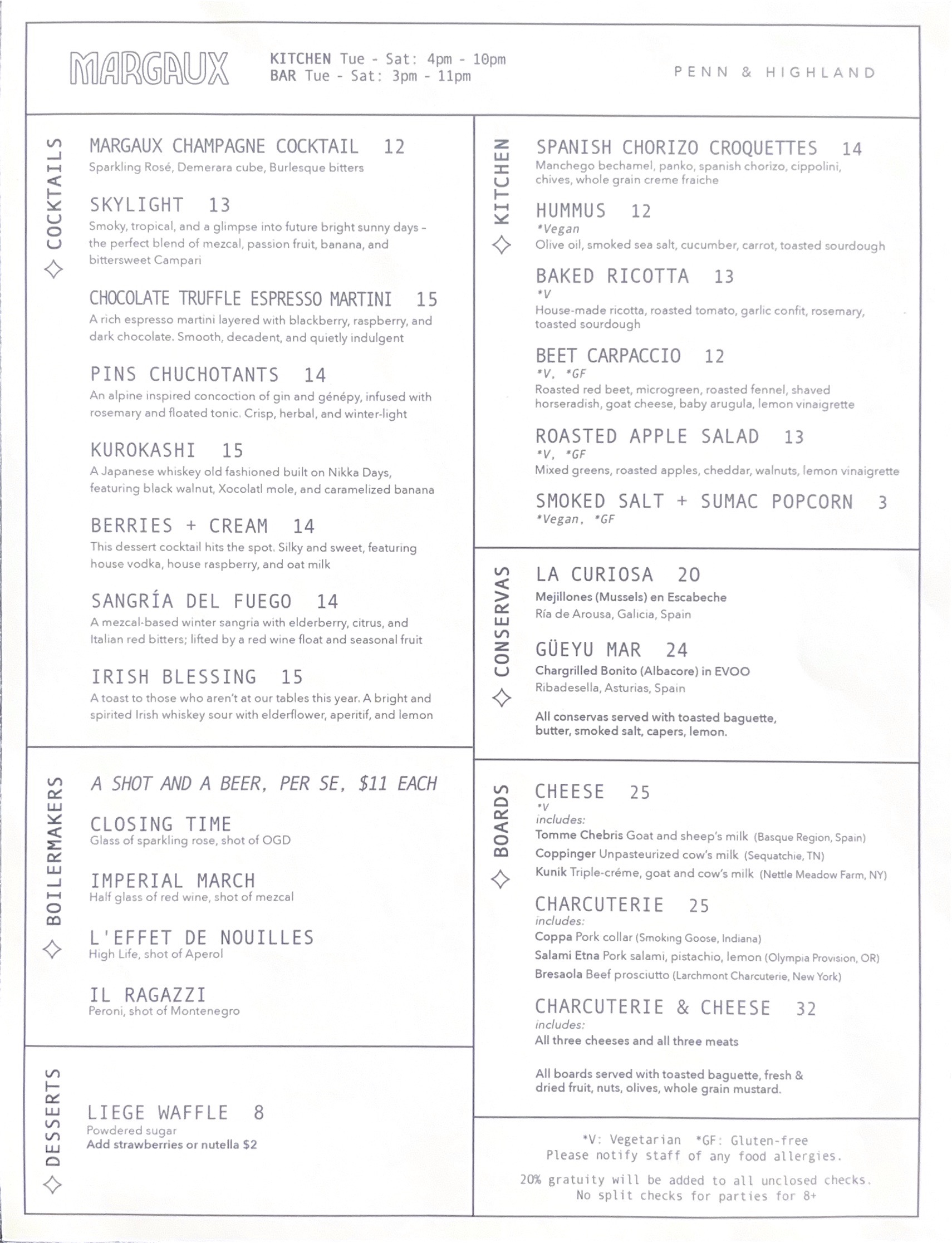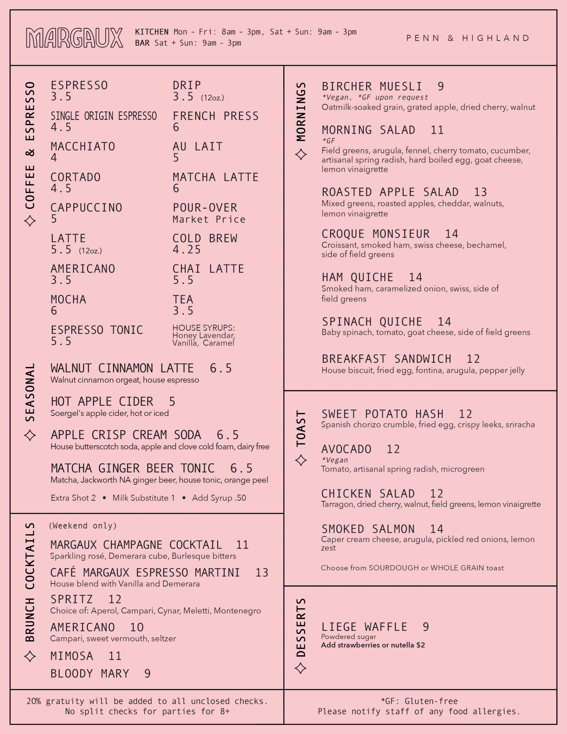 Margaux, located at the corner of Highland and Penn Avenue, is East Liberty’s newest café and bar. Inspired by the idea of hybrid European café-bar, Margaux offers specialty coffee, shareable plates, signature desserts, rotating cocktails, a handpicked wine and beer list. Margaux provides a modern and casual space for gourmands and romantics alike. During the day, enjoy our specialty coffee or sip on a velvety espresso while lounging on our cozy couches. In the evening, Margaux transforms into a sophisticated cocktail bar where you can experience the artistry of our talented bartenders. Whether you’re toasting with friends at our bespoke bar or relaxing with a latte on the couch, we invite you to spend some time at Margaux.